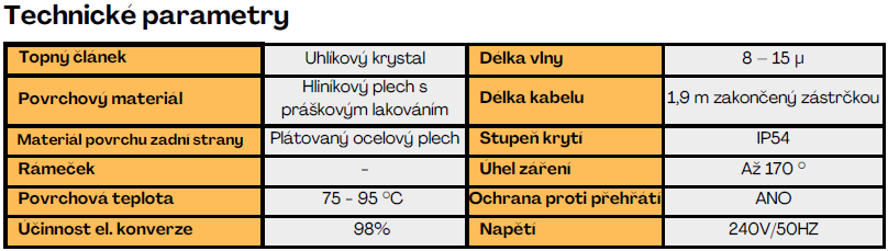 RYCHLÉ A EFEKTIVNÍOhřívá povrchy a objekty okamžitě, což vede k rychlému dosažení komfortní teploty.- Kompletní specifikace