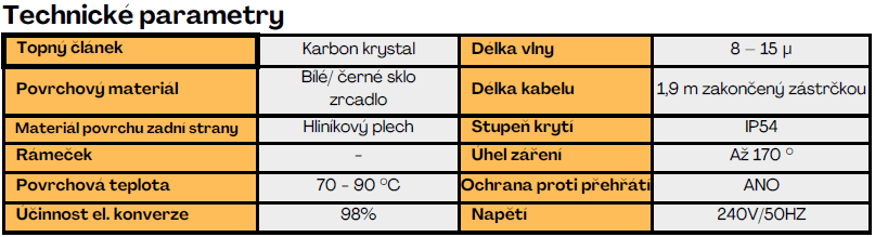 RYCHLÉ A EFEKTIVNÍOhřívá povrchy a objekty okamžitě, což vede k rychlému dosažení komfortní teploty.- Kompletní specifikace